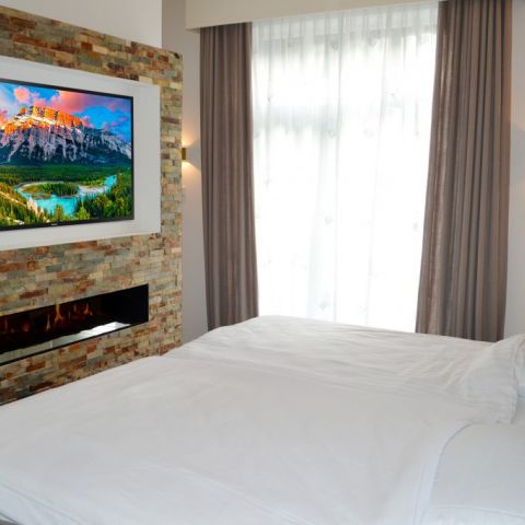 2. 1 master bedroom met king size bed, elektrische openhaard en luxe badkamer (2-persoons jacuzzi, 2-persoons douche met sunshower, sauna, dubbele wastafel, toilet en urinoir)